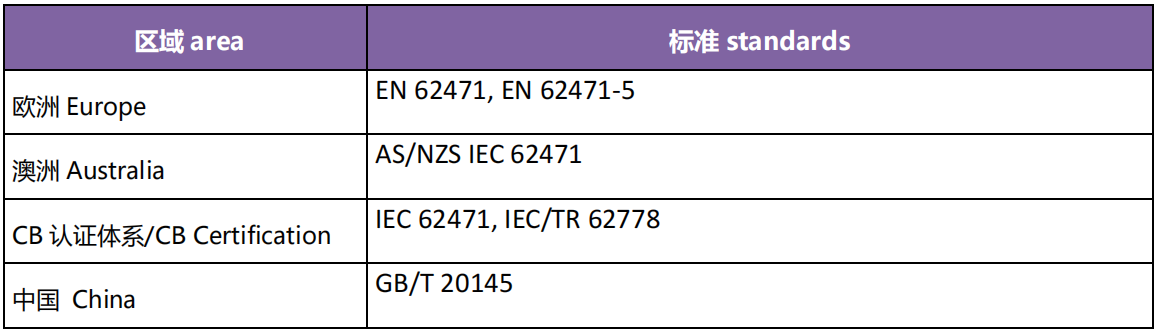 危害、視網(wǎng)膜藍光危害、視網(wǎng)膜熱危害、視網(wǎng)膜熱微弱危害。為評估燈和燈系統(tǒng)相關(guān)的光輻射危害,明確規(guī)定曝輻射限值,包括輻射照度,輻射亮度。根據(jù)測試數(shù)據(jù)對產(chǎn)品進行危害分級,包括豁免級,低危害,中等危害,高危害級別。