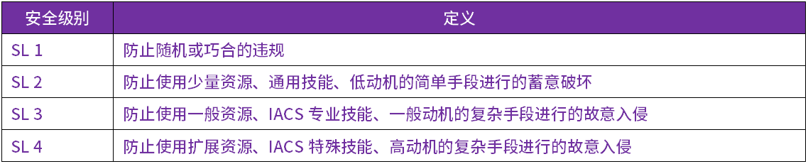 以上每個安全大類均定義了多個CR和RE(增強(qiáng))來映射到不同的安全級別SL中,安全級別越高,安全需求要求也越高。IEC 62443-4-2中定義了四種安全級別SL,如下:
