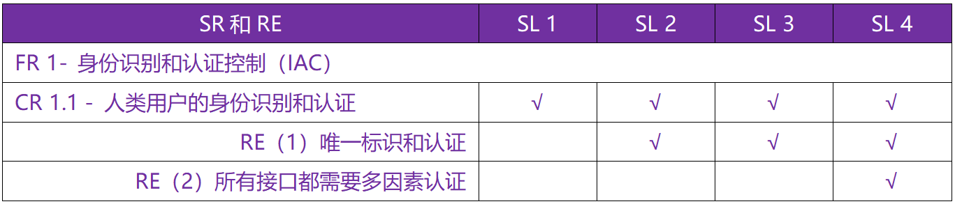 上面截圖所示,當(dāng)要達(dá)到安全級別3級,需要同時滿足CR 1.1、RE(1)的要求。當(dāng)要達(dá)到安全級別4級,需要同時滿足CR 1.1、RE(1)、RE(2)的要求。