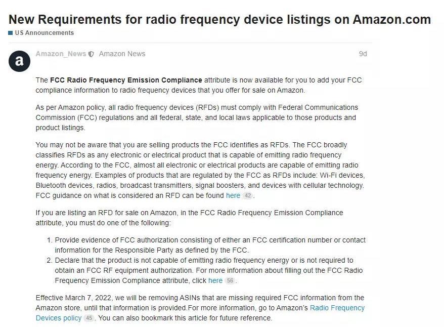 https://sellercentral.amazon.com/forums/t/new-requirements-for-radio-frequency-device-listings-on-amazon-com/958524