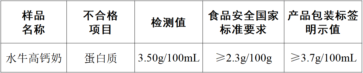蛋白質(zhì)是由氨基酸以肽鍵連接在一起,并形成一定空間結(jié)構(gòu)的高分子有機(jī)化合物。蛋白質(zhì)是構(gòu)成機(jī)體組織、器官的重要成分,是構(gòu)成機(jī)體多種重要生理活性物質(zhì)的成分,還能供給能量?!妒称钒踩珖?guó)家標(biāo)準(zhǔn) 調(diào)制乳》(GB 25191—2010)中規(guī)定,調(diào)制乳的蛋白質(zhì)含量應(yīng)≥2.3 g/100g,且該產(chǎn)品外包裝標(biāo)簽明示“優(yōu)質(zhì)乳蛋白≥3.7g/100mL”,檢測(cè)結(jié)果單位換算后,受檢本批次產(chǎn)品中蛋白質(zhì)的檢測(cè)值符合食品安全國(guó)家標(biāo)準(zhǔn)規(guī)定,但不符合產(chǎn)品明示質(zhì)量要求。