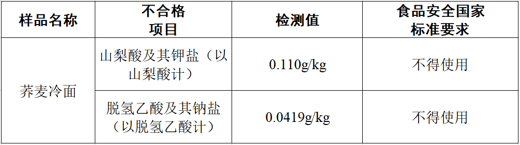 蕎麥冷面中檢出脫氫乙酸及其鈉鹽(以脫氫乙酸計(jì))的原因,可能是企業(yè)為延長(zhǎng)產(chǎn)品保質(zhì)期、或者彌補(bǔ)產(chǎn)品生產(chǎn)過(guò)程中衛(wèi)生條件不佳而超范圍使用。