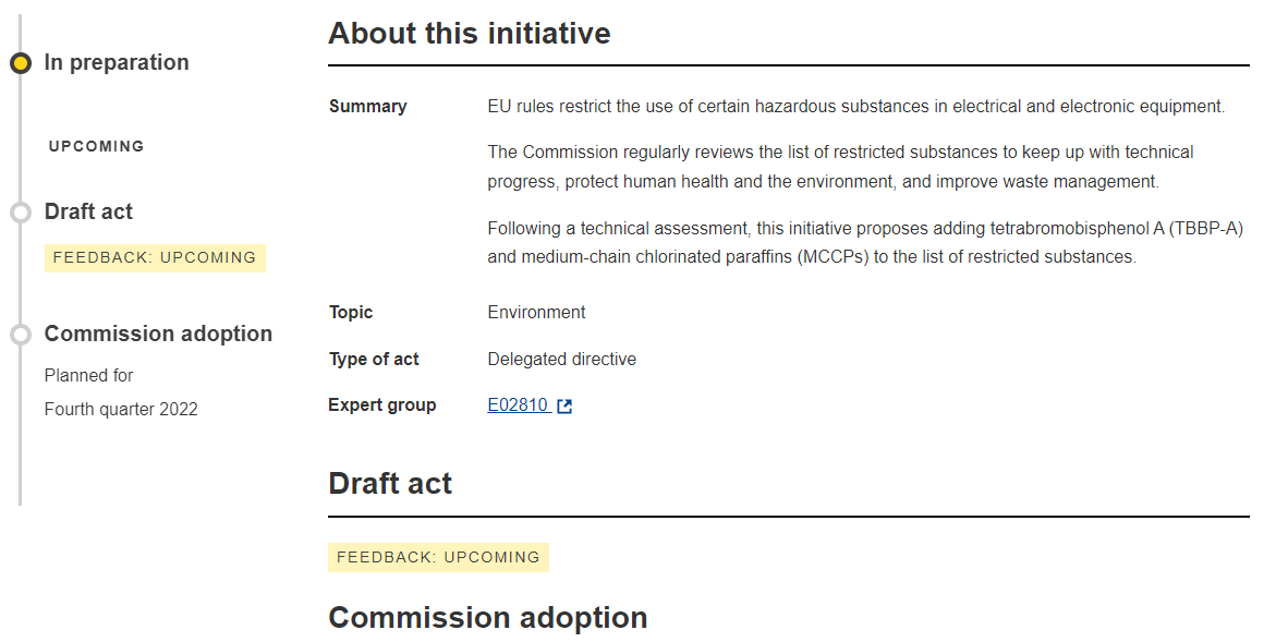 根據(jù)授權法案的立法流程,歐盟委員會在咨詢專家組意見后著手準備法案的草案,并提供給公眾及利益相關者評議。該動議所涉及的法案計劃在2022年第4季被正式采納成為RoHS指令的修訂案。