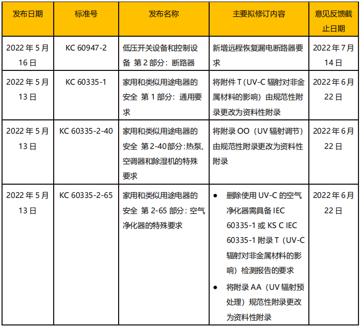 2022 年 6 月消息,韓國技術(shù)標準院(KATS)發(fā)布數(shù)項公告,就多個電氣安全標準和家用產(chǎn)品安全標準的修訂公開征求意見,相關(guān)內(nèi)容見下表。
