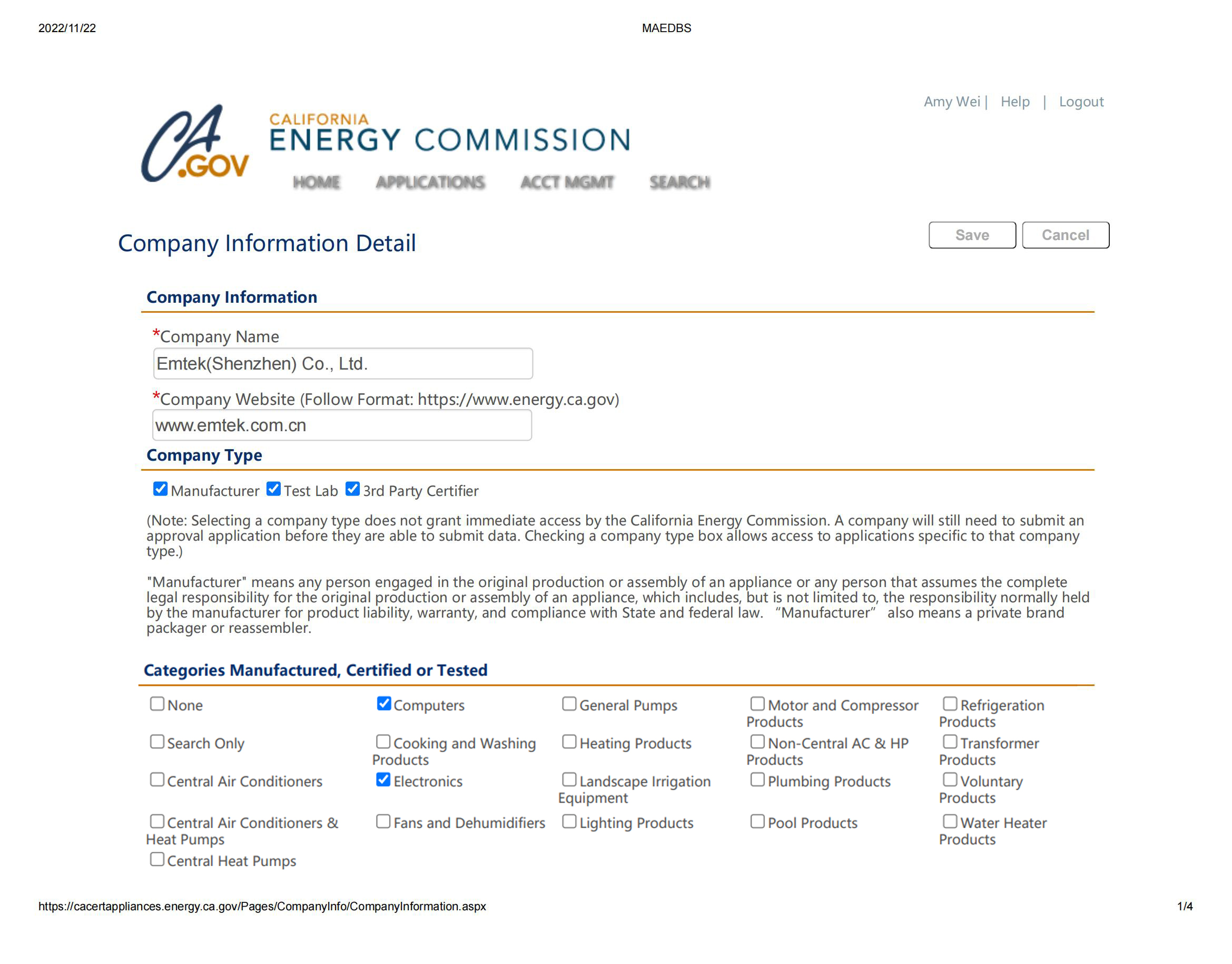 加州能源委員會(huì) (CEC) 要求受監(jiān)管的電器必須滿足CEC Title20電器能效標(biāo)準(zhǔn)要求,并在CEC能效數(shù)據(jù)庫(kù)系統(tǒng)(MAEDbS)中注冊(cè)列名,注冊(cè)信息包括品牌名稱、制造商名稱和型號(hào)等。