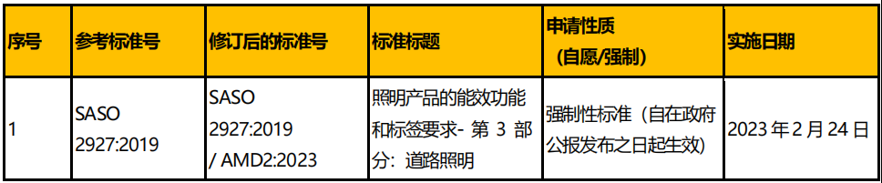 SASO 2927:2019 《照明產(chǎn)品的能效要求、操作要求和標(biāo)簽——第三部分:道路照明》 包括(第10.2 項(xiàng))LED 要求,刪除 “色溫必須在3000-6000 K 之間” 的表述。