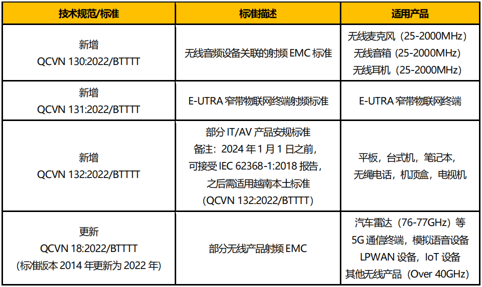 2023年2月8日,越南電信部(MIC)發(fā)布強(qiáng)制認(rèn)證法規(guī)草案,將取代去年5 月發(fā)布的02/2022/TT-BTTTT。新草案當(dāng)前尚在公咨期,預(yù)計(jì)第二季度正式發(fā)布。