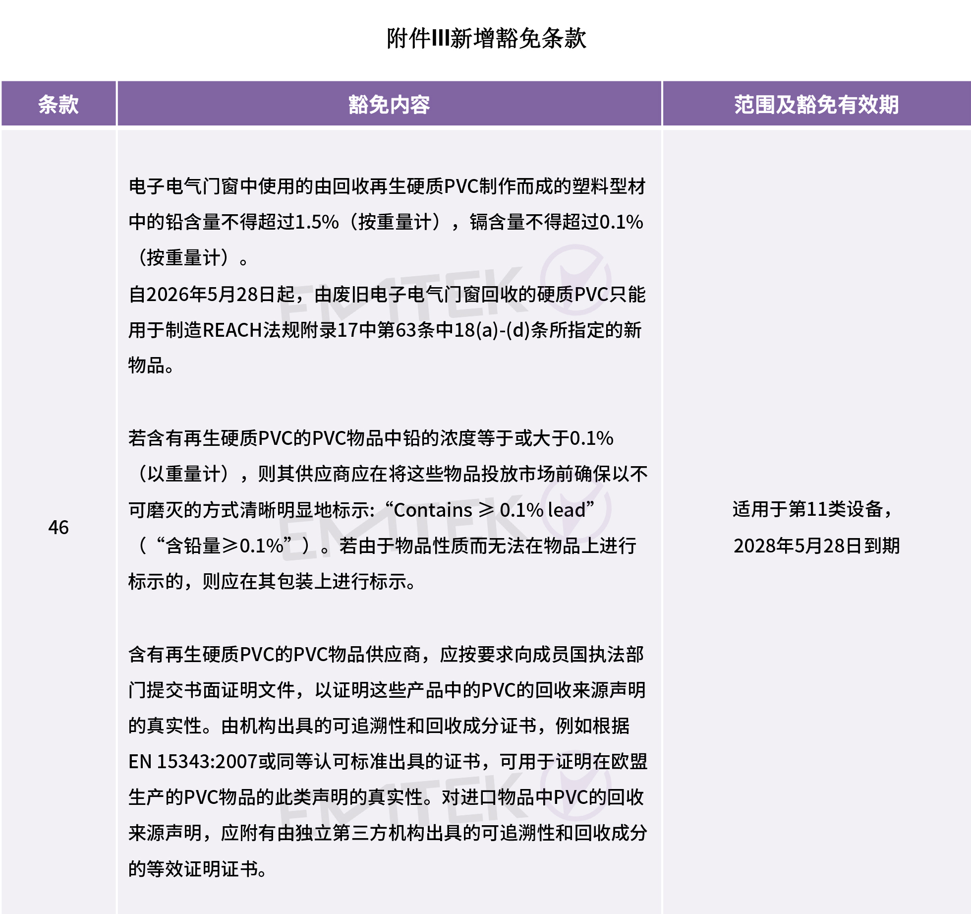 2023年6月27日,歐盟發(fā)起了針對RoHS 指令附件III中新增第46條豁免條款的公眾評議,該豁免條款針對電子電氣門窗中使用的硬質(zhì)回收PVC材料中l(wèi)ead 和cadmium的豁免,在2023年7月25號之前,各利益相關(guān)方都可以提供反饋意見;同時,歐盟于2023年6月30號向WTO發(fā)布了G/TBT/N/EU/990通報,預(yù)計將于今年9月份采納。