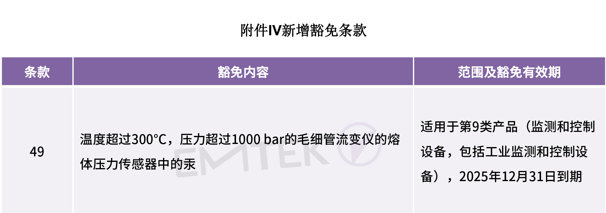 2023年7月11日,歐盟官方公報發(fā)布了指令(EU)2023/1437,在RoHS指令附件IV中新增第49條關(guān)于汞的豁免條款,針對第9類產(chǎn)品 - 監(jiān)測和控制設(shè)備,包括工業(yè)監(jiān)測和控制設(shè)備,將于發(fā)布后的20天后生效。