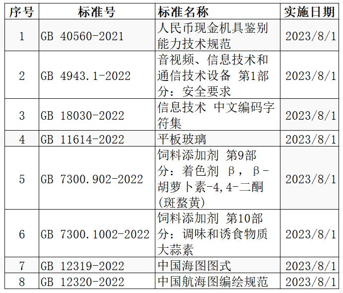 2023 年7 月消息,自2023 年8 月1 日起,8 項強(qiáng)制性國家標(biāo)準(zhǔn)、9 項推薦性國家標(biāo)準(zhǔn)開始實(shí)施,具體標(biāo)準(zhǔn)名單如下: