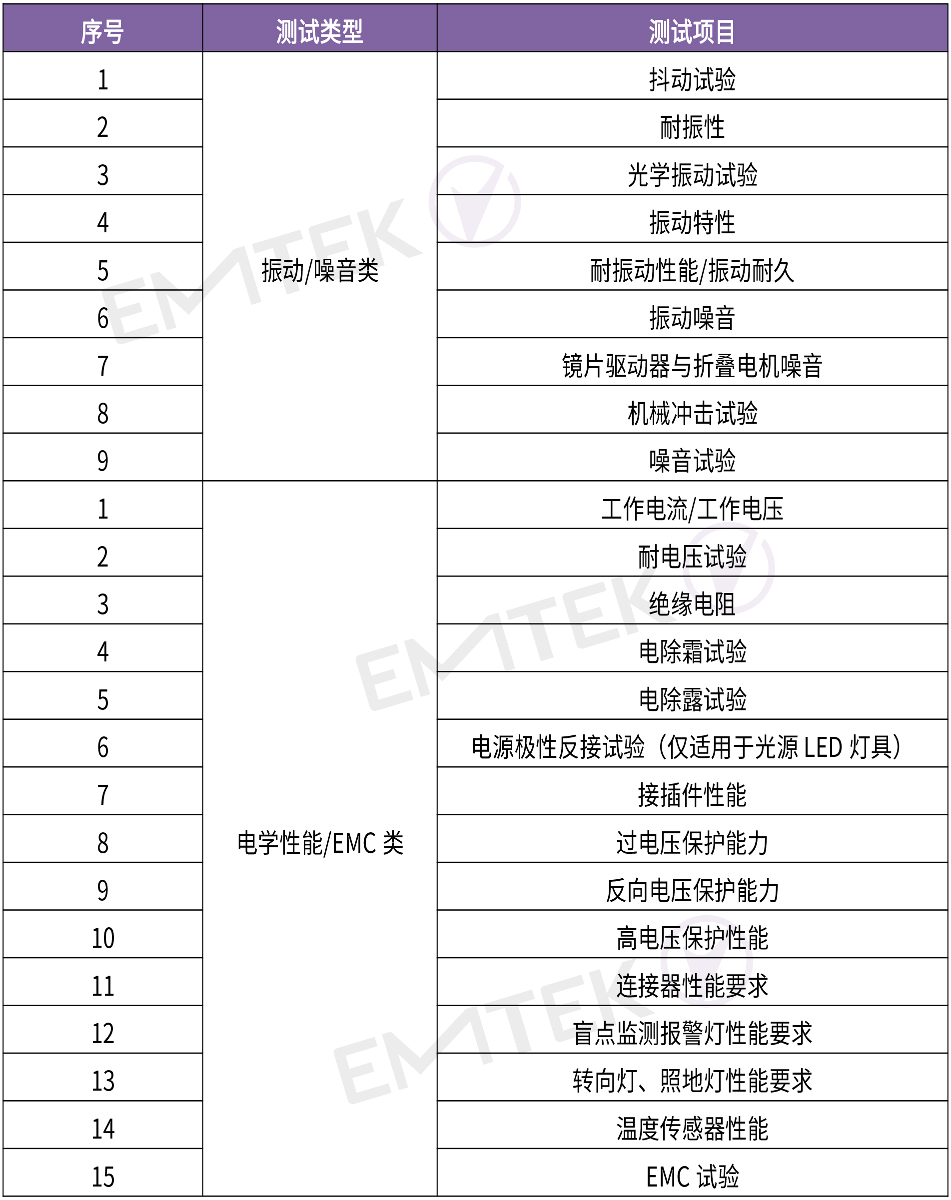 3. 電學(xué)試驗:考核后視鏡及其相關(guān)電器件(如轉(zhuǎn)向燈等)環(huán)境和功能試驗前后的電學(xué)性能,驗證其是否能正常使用;