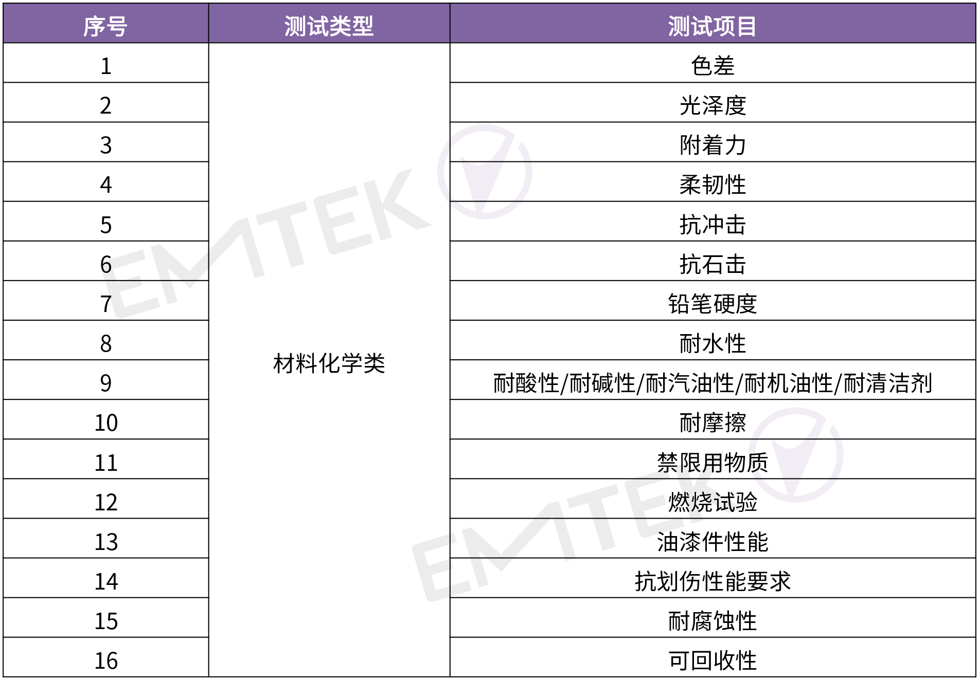 4. 材料化學(xué)試驗:考核后視鏡及其噴漆件材料化學(xué)性能,比如耐酸性、耐堿性、耐洗滌性、耐汽油、耐酒精、耐摩擦、耐沖擊、濕熱儲存、耐水性、耐指紋、耐機(jī)油、鉛筆硬度、有害物質(zhì)限定試驗、燃燒特性試驗等。