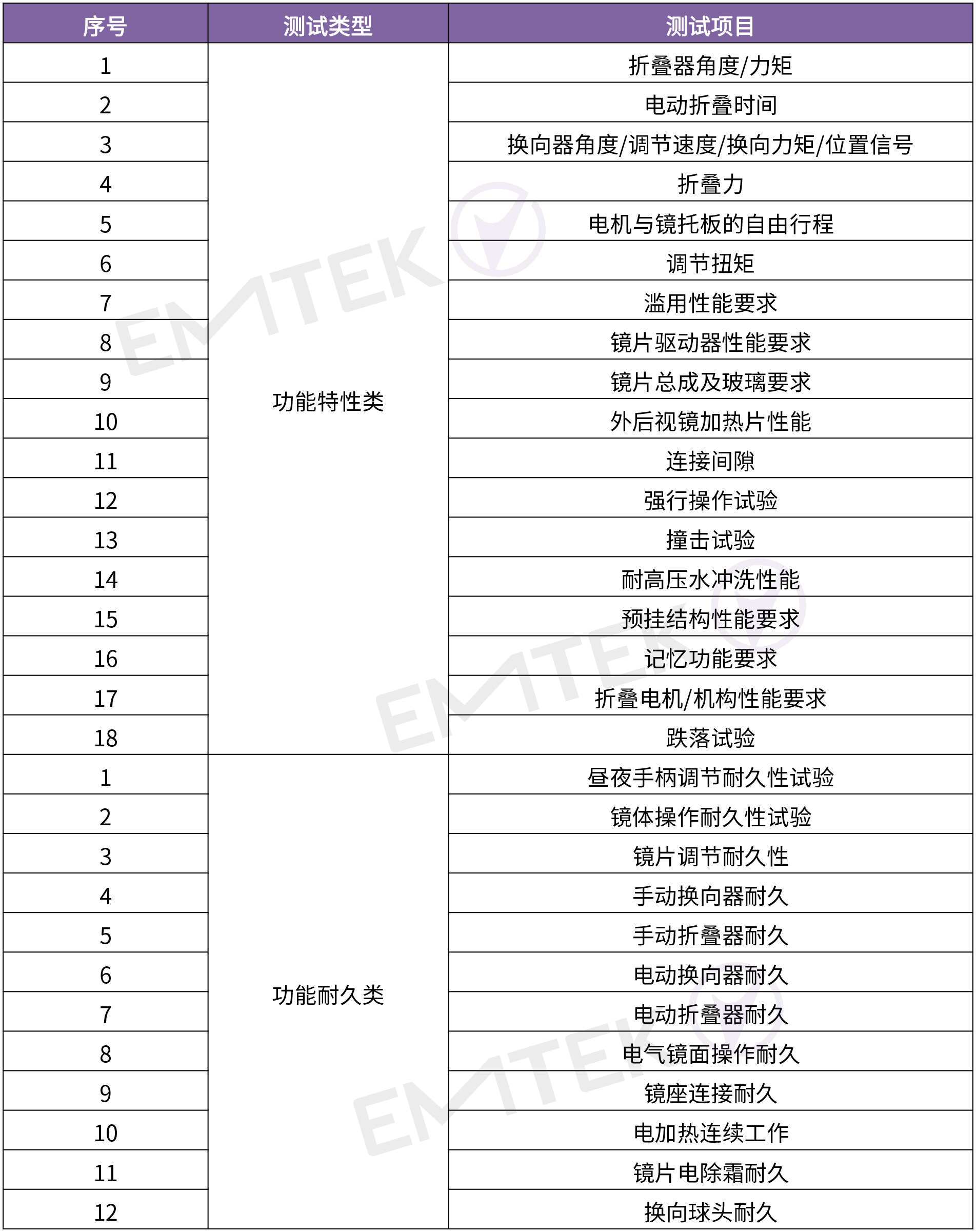 2. 功能可靠性試驗:考核后視鏡使用過程中承受的強(qiáng)度和剛性、操作功能特性及耐久、振動試驗,比如折疊器性能、換向器性能、手動/電動換向器/折疊器耐久、鏡面操作耐久、撞擊性能、振動耐久、噪音試驗等;