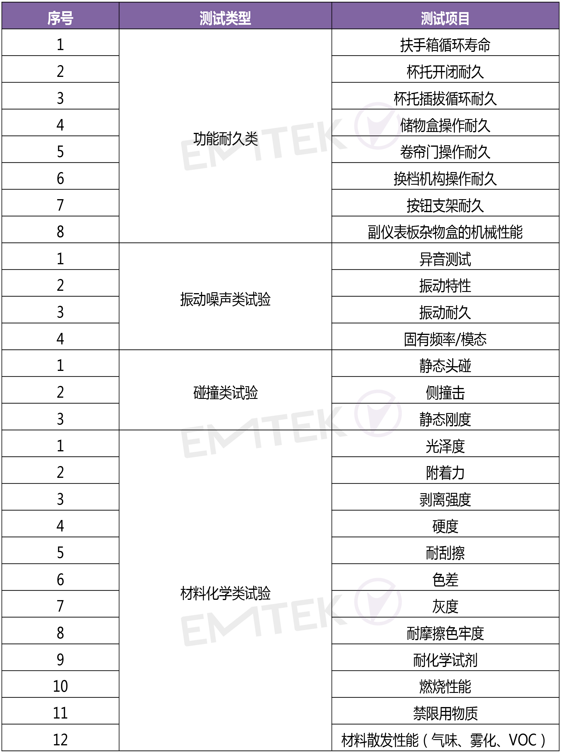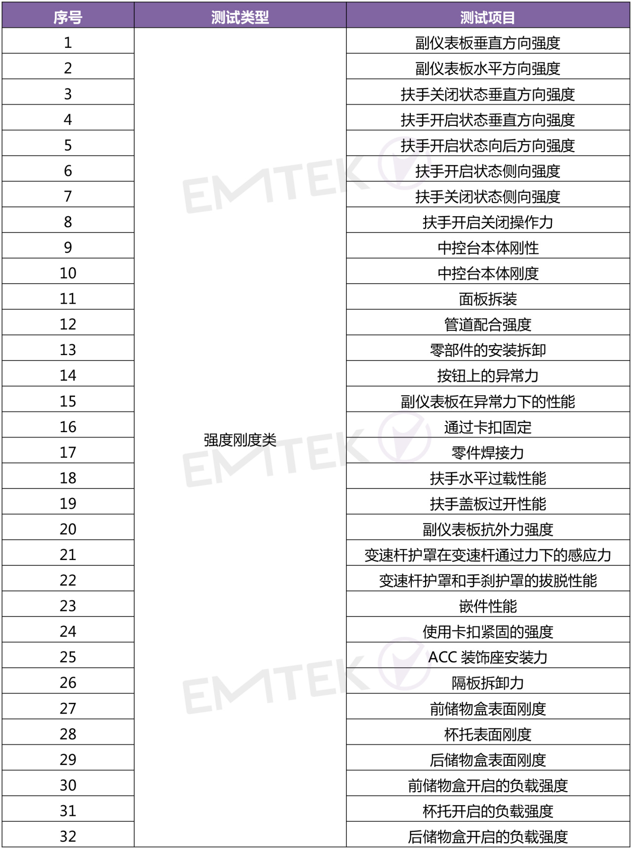 考核副儀表板使用過程中承受的強(qiáng)度和剛性、操作功能特性及耐久、振動(dòng)試驗(yàn)、碰撞試驗(yàn),比如副儀表板垂直/水平方向強(qiáng)度、扶手箱循環(huán)壽命、杯托開閉耐久、振動(dòng)特性、振動(dòng)耐久、頭碰、側(cè)撞擊等;