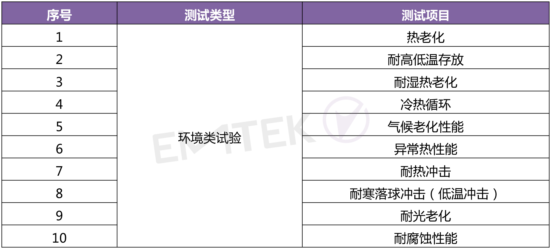 是將產(chǎn)品暴露在自然的或人工的環(huán)境條件下經(jīng)受其作用,以評價產(chǎn)品在實際使用、運輸和貯存的環(huán)境條件下的性能,并分析研究環(huán)境因素的影響程度,包含的環(huán)境試驗如熱老化、低溫存放、冷熱循環(huán)、耐寒落球沖擊、耐光老化等;