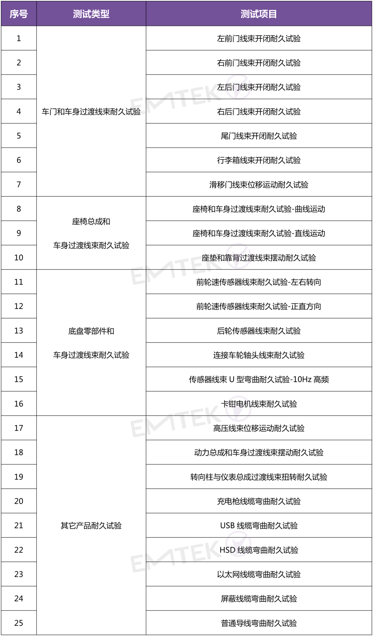 線束設(shè)計標(biāo)準(zhǔn)規(guī)范中定義了各類型過渡線束疲勞耐久的試驗方法和要求,在產(chǎn)品工藝定型前完成試驗。測試類型主要有:車門線束開閉疲勞耐久試驗、座椅和車身過渡線束往復(fù)運動耐久試驗、底盤零件和車身過渡線束振動或位移運動耐久試驗、動力總成和車身過渡線束擺動耐久試驗。EMTEK信測標(biāo)準(zhǔn)實驗室有十幾年各類型過渡線束耐久測試經(jīng)驗。多年的積累,培養(yǎng)了一支專家團(tuán)隊,可自主開發(fā)模擬安裝條件的工裝和測試裝置,研發(fā)實現(xiàn)不同運動曲線和運動頻率的測控系統(tǒng),并獲得多項發(fā)明專利。