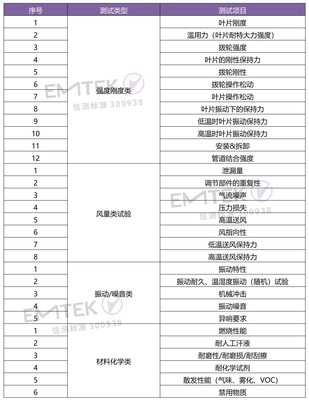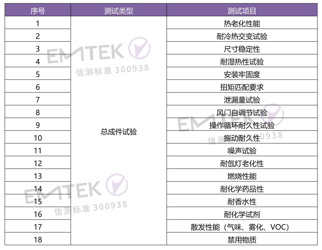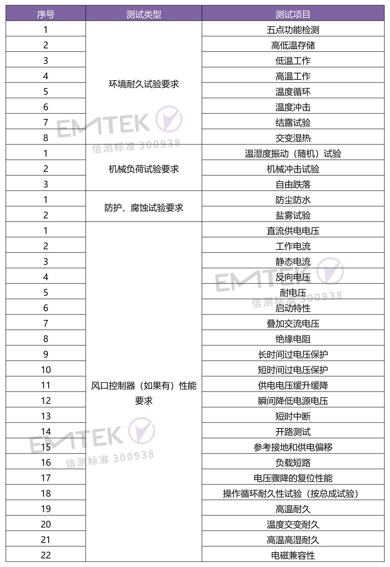 考核電動出風口控制器性能、總成試驗性能、防塵防水、EMC等;