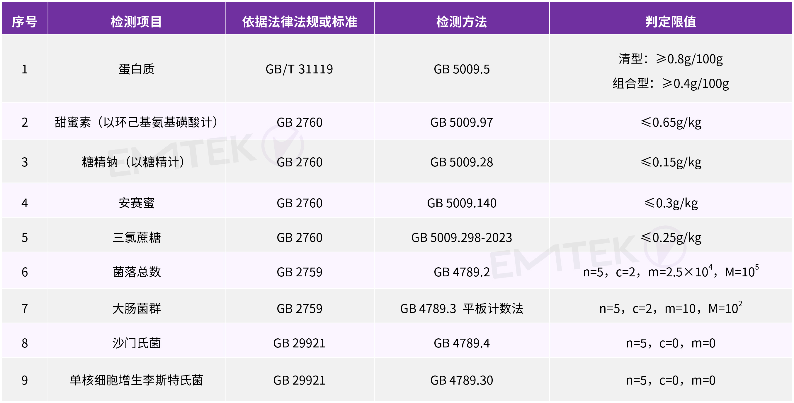 雪糕在《2024年全國食品安全監(jiān)督抽檢實(shí)施細(xì)則》中被劃分到冷凍飲品一類。參照的產(chǎn)品標(biāo)準(zhǔn)有GB/T 31119-2014《冷凍飲品 雪糕》和GB 2759-2015 《食品安全國家標(biāo)準(zhǔn) 冷凍飲品和制作料》,檢測項(xiàng)目和檢測限值見下表。