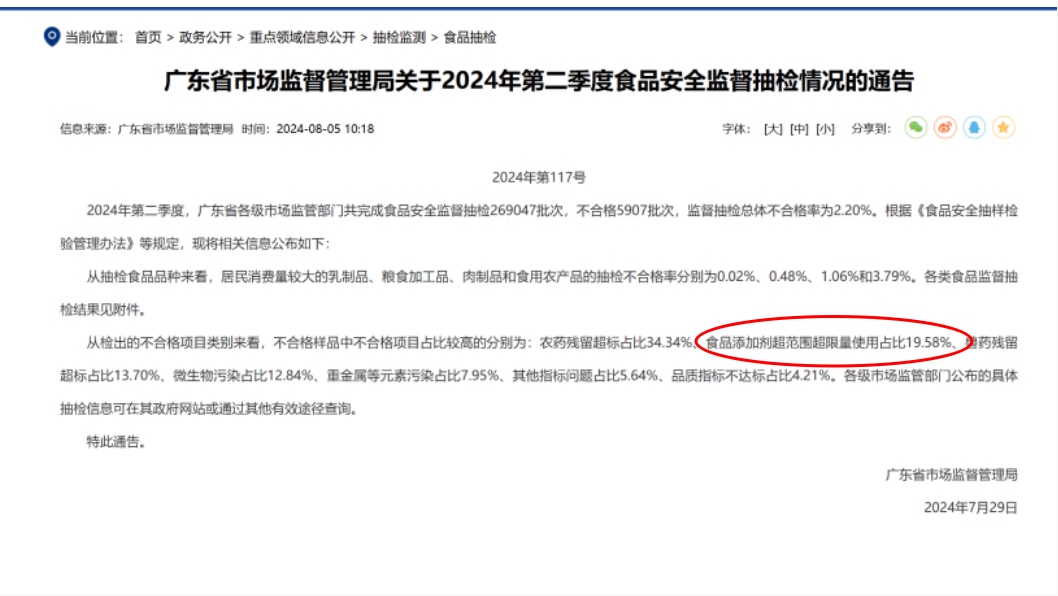 根據(jù)廣東省市場監(jiān)督管理局官網(wǎng)發(fā)布的2024年第二季度食品安全監(jiān)督抽檢情況的通告可知,食品添加劑超范圍超限量使用的情況占不合格批次的19.58%,不合格率排名第二。