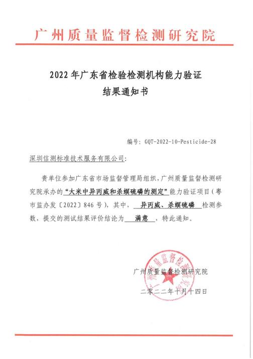 近日,在由廣東省市場監(jiān)督管理局組織、廣州質(zhì)量監(jiān)督檢測研究院承辦的“2022廣東省檢驗檢測機(jī)構(gòu)能力驗證”中,信測標(biāo)準(zhǔn)參加的“大米中鎘、異丙威和殺螟硫磷的測定”食品檢測領(lǐng)域3個能力驗證項目,均獲得“滿意”!