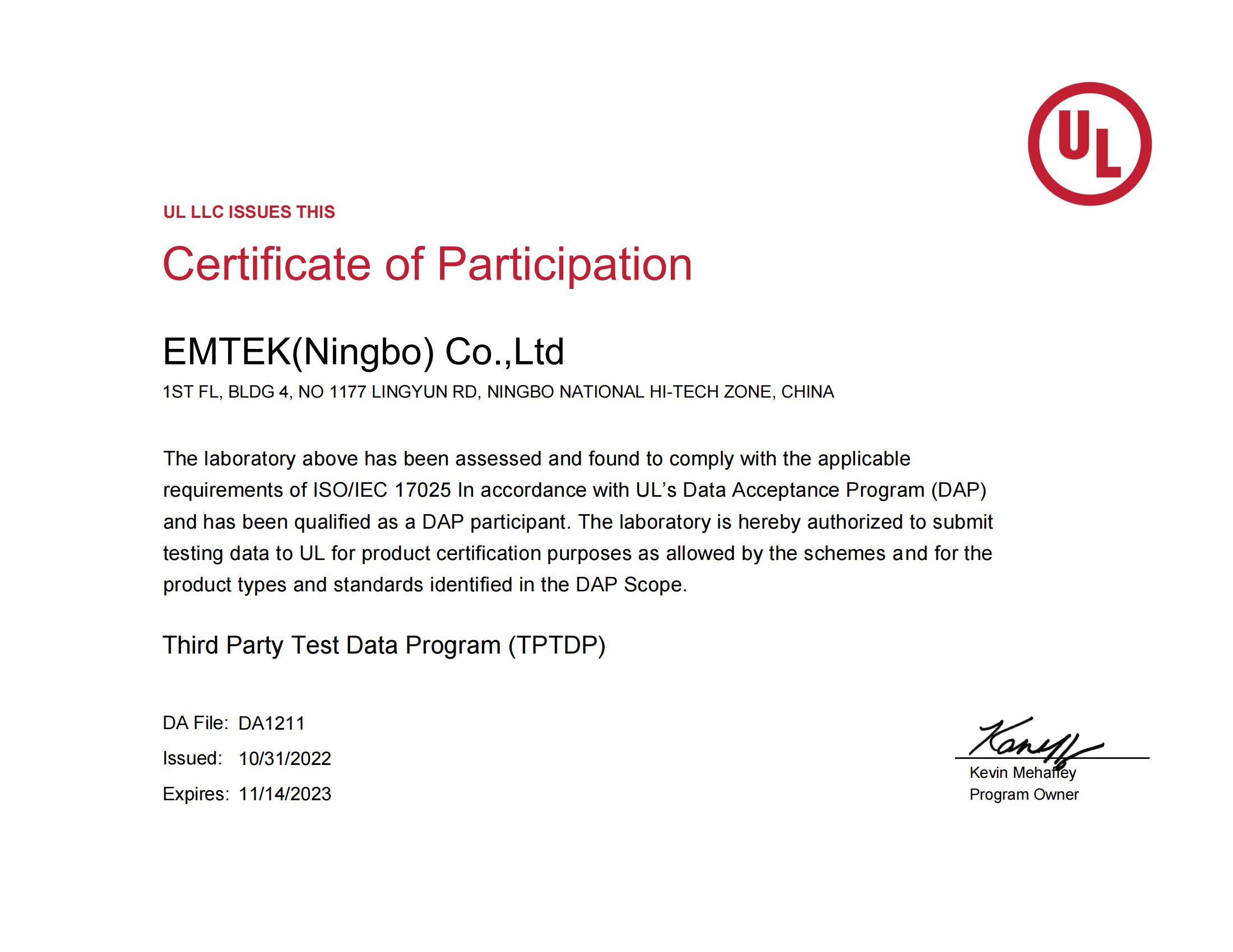 近日,寧波市信測檢測技術有限公司順利通過UL-CAP復評審,收到美國UL公司簽發(fā)TPTDP資質續(xù)期證書。