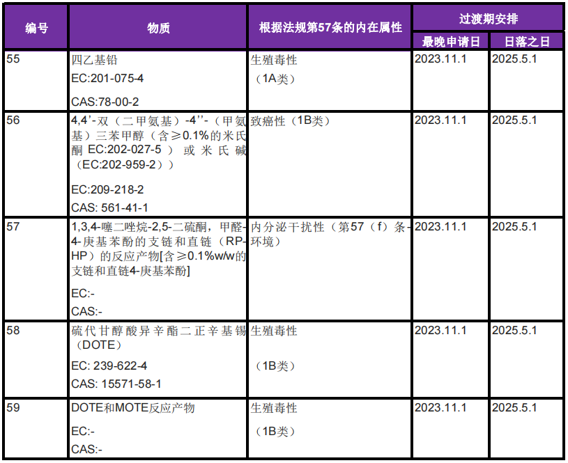 歐盟委員會(huì)于2022年4月11日在官方公報(bào)上發(fā)布了關(guān)于REACH法規(guī)的修訂案—— (EU) 2022/586,在附件XIV中新增5項(xiàng)授權(quán)物質(zhì)。至此,授權(quán)物質(zhì)共計(jì)59項(xiàng)。該法規(guī)將于官方公報(bào)公布后第20日即5月1日開始生效。