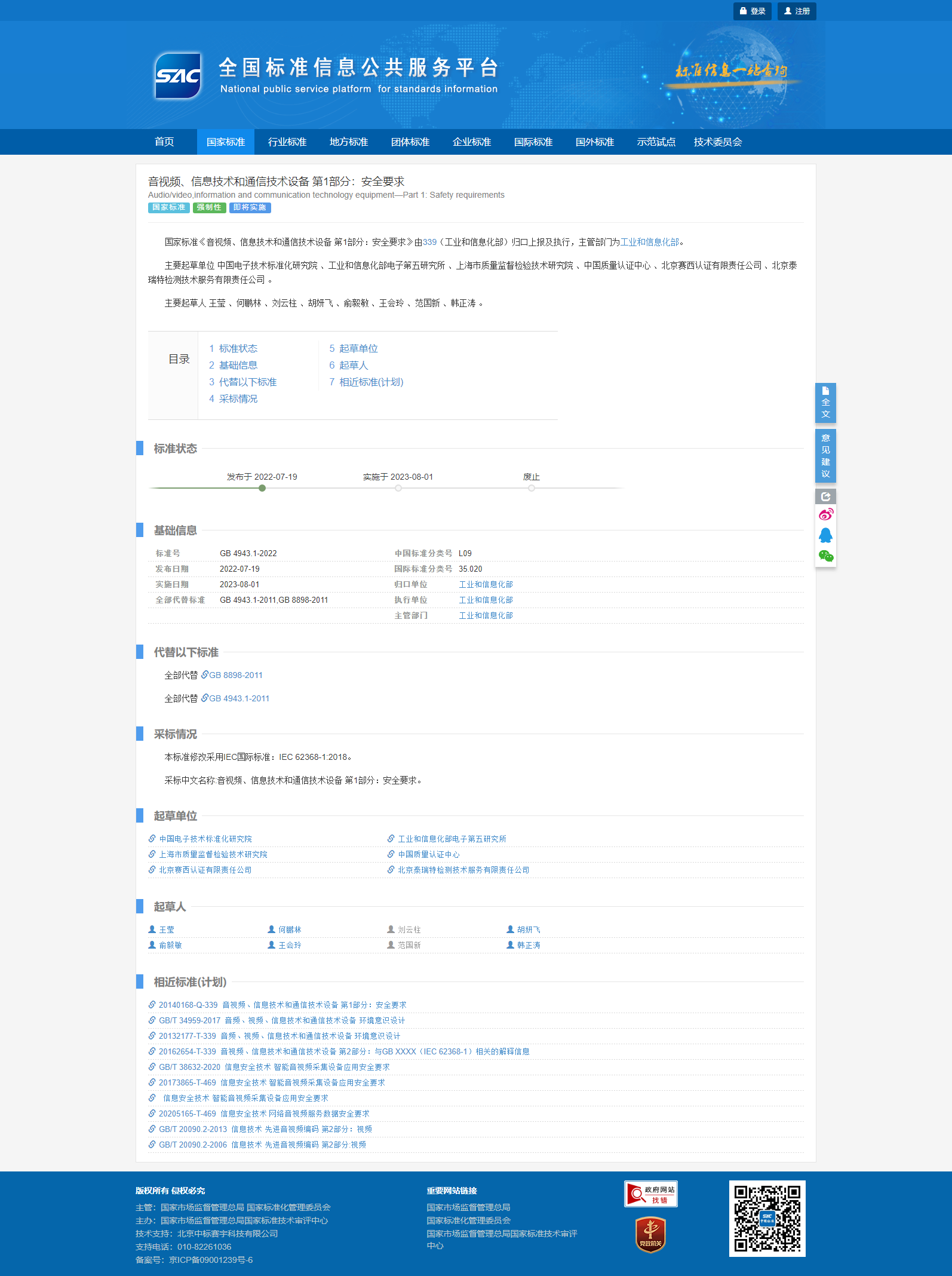 2022年07月19日,工業(yè)和信息化部正式發(fā)布國家標(biāo)準(zhǔn)GB 4943.1-2022,也就是《音視頻、信息技術(shù)和通信技術(shù)設(shè)備 第1部分:安全要求 Audio/video,information and communication technology equipment—Part 1: Safety requirements》,新國標(biāo)將于2023年8月1日全面實(shí)施。該標(biāo)準(zhǔn)修改采用國際標(biāo)準(zhǔn)IEC 62368-1:2018,將代替國家標(biāo)準(zhǔn)GB 4943.1-2011和GB 8898-2011。