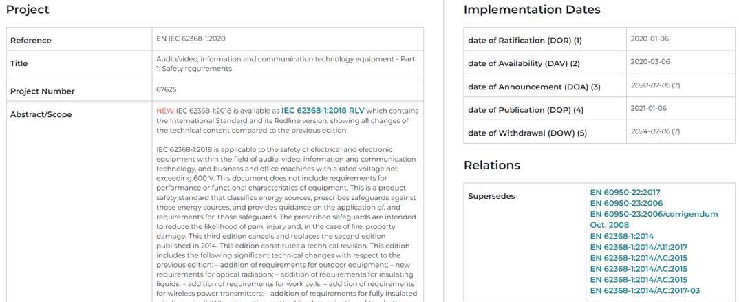 為了解決這一問題,并綜合考慮到未來EN IEC 62368-1第四版的出版,以及它在EUOJ中LVD和RED下的潛在引用,經(jīng)過TC108X成員投票,大多數(shù)成員同意將EN IEC 62368-1:2020(第三版)的強(qiáng)制執(zhí)行日期延長18個月至2024年7月6日。在此日期之前,仍然可以使用EN 62368-1:2014(第二版)申請CE。如下為CENELEC網(wǎng)站更新公示信息,EN IEC 62368-1:2020(第三版)的DOW是2024年7月6日。