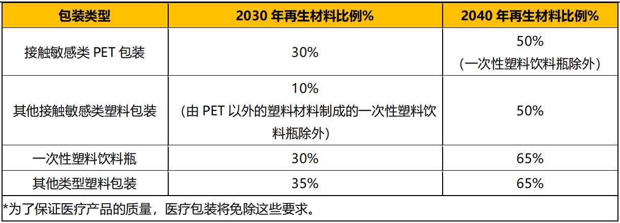 再生材料比例目標(biāo)PPWR 提案針對(duì)特定包裝類(lèi)別,規(guī)定了強(qiáng)制性再生材料含量比例,相關(guān)要求自 2030 年 1 月 1 日起實(shí)施。