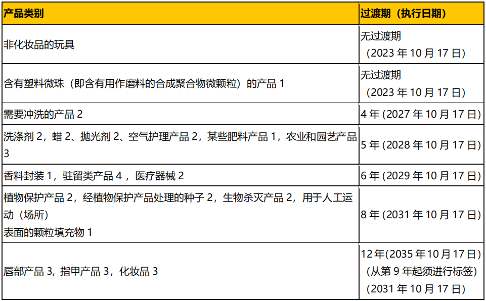 (3)自 2035 年 10 月 17 日起,唇部產(chǎn)品、指甲產(chǎn)品以及化妝品除非此類產(chǎn)品屬于第(1)或(2)點。如唇部產(chǎn)品、指甲產(chǎn)品以及化妝品含有微珠,則自 2023 年 10 月 17 日起適用;