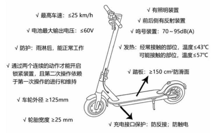 該標準要求電動滑板車的最高車速不得大于 25km/h,電池最大輸出電壓不得大于 60V。主要從電動滑板車的機械強度和電氣安全方面做出了具體的要求。除此之外,電動滑板車還應(yīng)裝有照明裝置、反射裝置和鳴號裝置等,多方面的規(guī)范以保障電動滑板車的安全使用。