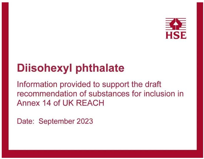 2023 年9 月,英國 HSE 發(fā)布了一份關(guān)于將“鄰苯二甲酸二異己酯(Diisohexyl phthalate, EC:276-090-2,CAS:71850-09-4)”納入授權(quán)清單(附件14)的推薦草案,以履行英國UK-REACH 法規(guī)所規(guī)定的義務(wù)。