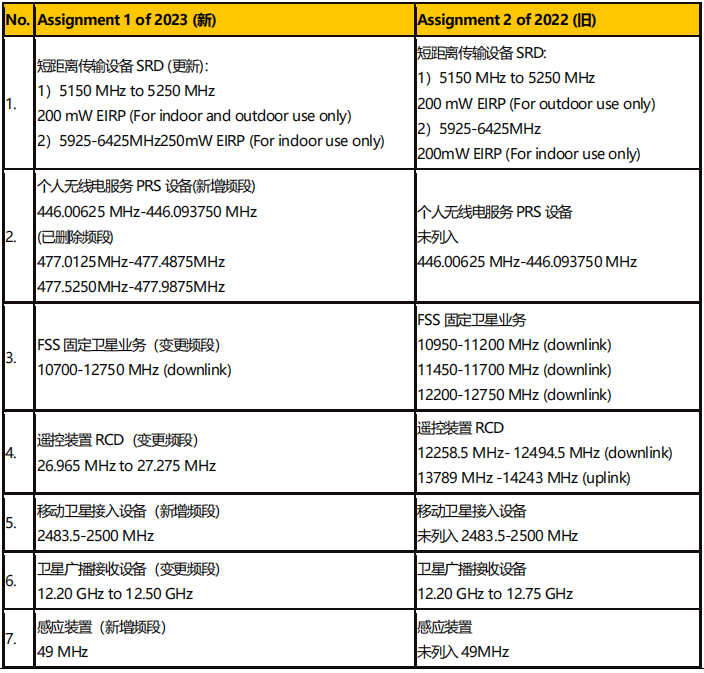 馬來西亞通訊與多媒體委員會(MCMC)于8 月28 日發(fā)布了2023 年第 1 號分配表(Class Assignment 1 of 2023), 取代2022 年7 月25 日生效的分配表(Class Assignment No.2 of 2022)。新版分配表詳細列出了不同產(chǎn)品無線規(guī)格、適用頻段、功率限值以及管控Schedule 具體要求(共計30 類 Schedule)。