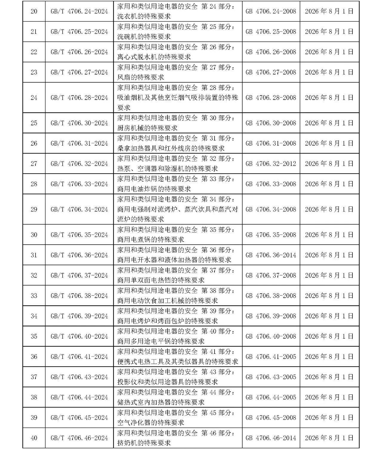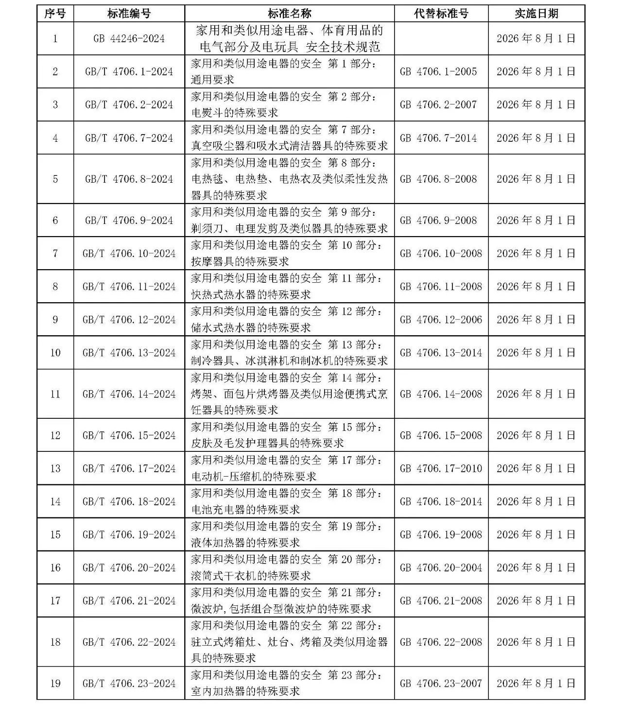 2024年7月24日,國(guó)家標(biāo)準(zhǔn)化管理委員會(huì)發(fā)布《關(guān)于批準(zhǔn)發(fā)布<壓力容器 第1部分:通用要求>等218項(xiàng)國(guó)家標(biāo)準(zhǔn)和1項(xiàng)國(guó)家標(biāo)準(zhǔn)修改單的公告》(中華人民共和國(guó)國(guó)家標(biāo)準(zhǔn)公告 2024年第15號(hào))及《關(guān)于批準(zhǔn)發(fā)布<家用和類(lèi)似用途單相插頭插座 型式、基本參數(shù)和尺寸>等12項(xiàng)強(qiáng)制性國(guó)家標(biāo)準(zhǔn)和1項(xiàng)強(qiáng)制性國(guó)家標(biāo)準(zhǔn)修改單的公告》(中華人民共和國(guó)國(guó)家標(biāo)準(zhǔn)公告 2024年第16號(hào))。其中批準(zhǔn)發(fā)布GB 44246-2024《家用和類(lèi)似用途電器、體育用品的電氣部分及電玩具 安全技術(shù)規(guī)范》強(qiáng)制性國(guó)家標(biāo)準(zhǔn)及GB/T 4706.1-2024《家用和類(lèi)似用途電器的安全 第1部分:通用要求》等102項(xiàng)家電推薦性國(guó)家標(biāo)準(zhǔn),共計(jì)103項(xiàng)。